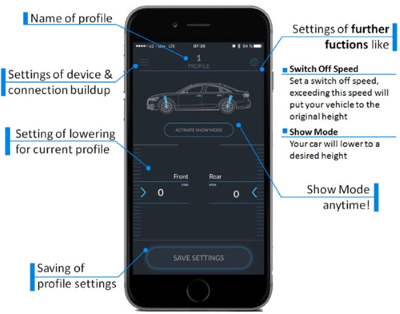 Le module de commande de suspension pneumatique MODE vous permet d'abaisser votre voiture avec une suspension pneumatique d'usine équipée via une application pour smartphone avec connectivité Bluetooth.